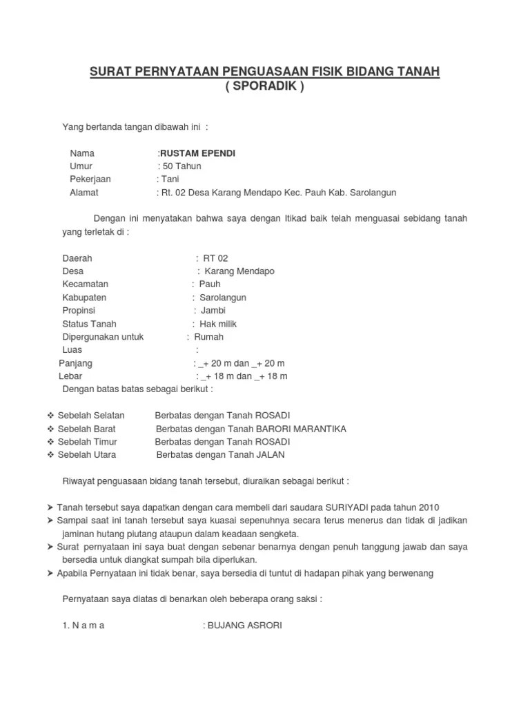 Contoh surat pernyataan penguasaan fisik bidang tanah (sporadik) doc / word. Asli sporadik lama (jika pernah dibuat), bila hilang dibuktikan dengan . Contoh surat pernyataan penguasaan fisik bidang tanah (sporadik) doc / word. Contoh surat pernyataan penguasaan fisik bidang tanah (sporadik) doc / word. Jujur saya sebenarnya tidak begitu bisa menjelaskan fungsi dari surat .